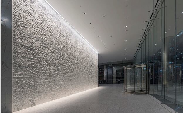 This bas-relief artwork, a subtraction rather than an addition to the white marble of the lobby, evokes a topographical map. Each tile, cut with a robotic router, reproduces a complex and multifaceted network of roots, recalling both natural and artificial systems of organization.